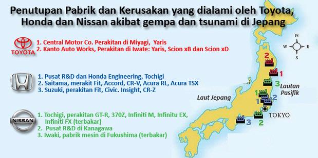 Lokasi pabrik Toyota, Honda dan Nissan yang rusak.